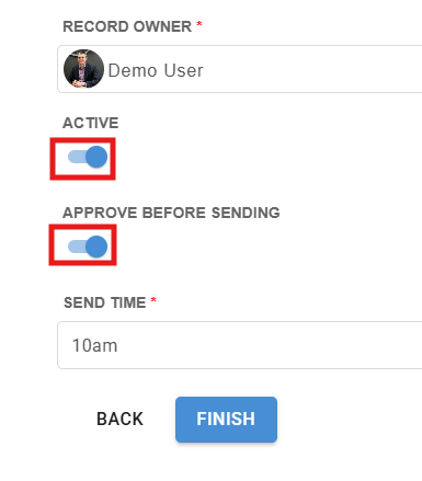 To activate any individual automated email, click into the square of the specific email automation and select the 'next' button all the way to the last section where you can turn it on with the toggle for 'active' and can also turn on the 'approve before sending'. You can even set the time for the email to send and approve. Then press Finish.