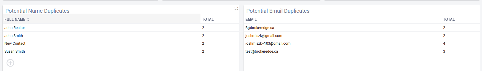 Note: You can also see a list of potential duplicates by navigating to Home Dashboard > Contact Reports and scrolling to the bottom: