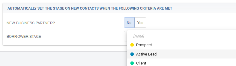 4. If you want to automatically set the stage when a new business partner is created or a contact is in a specific borrower stage, you can se the fields below to specify that as well.