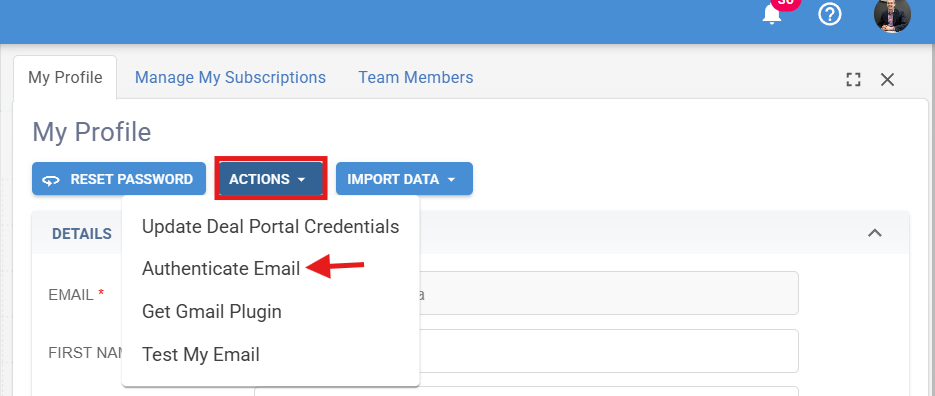My profile>select the Actions dropdown button >and select Authenticate Email and make sure you select the email that is associated with you Brokeredge account.