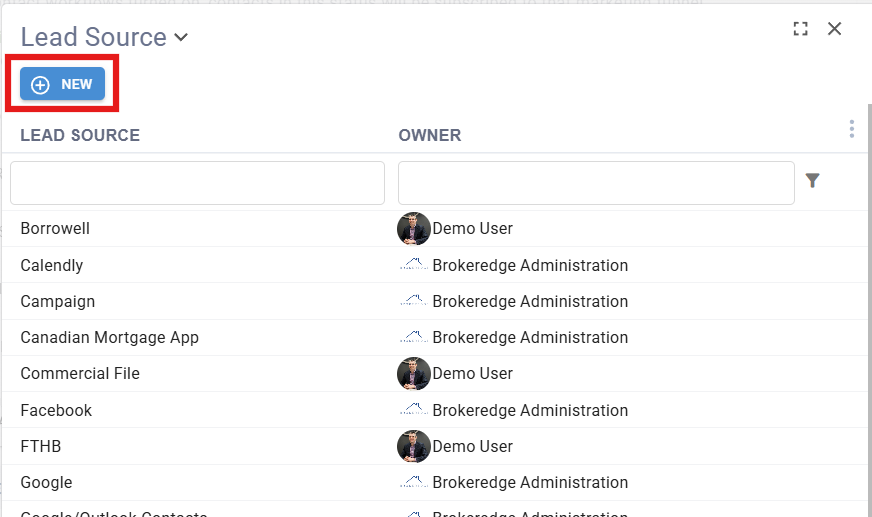 - Click the magnifying glass symbol. This will open up the page where you see all current leads sources.