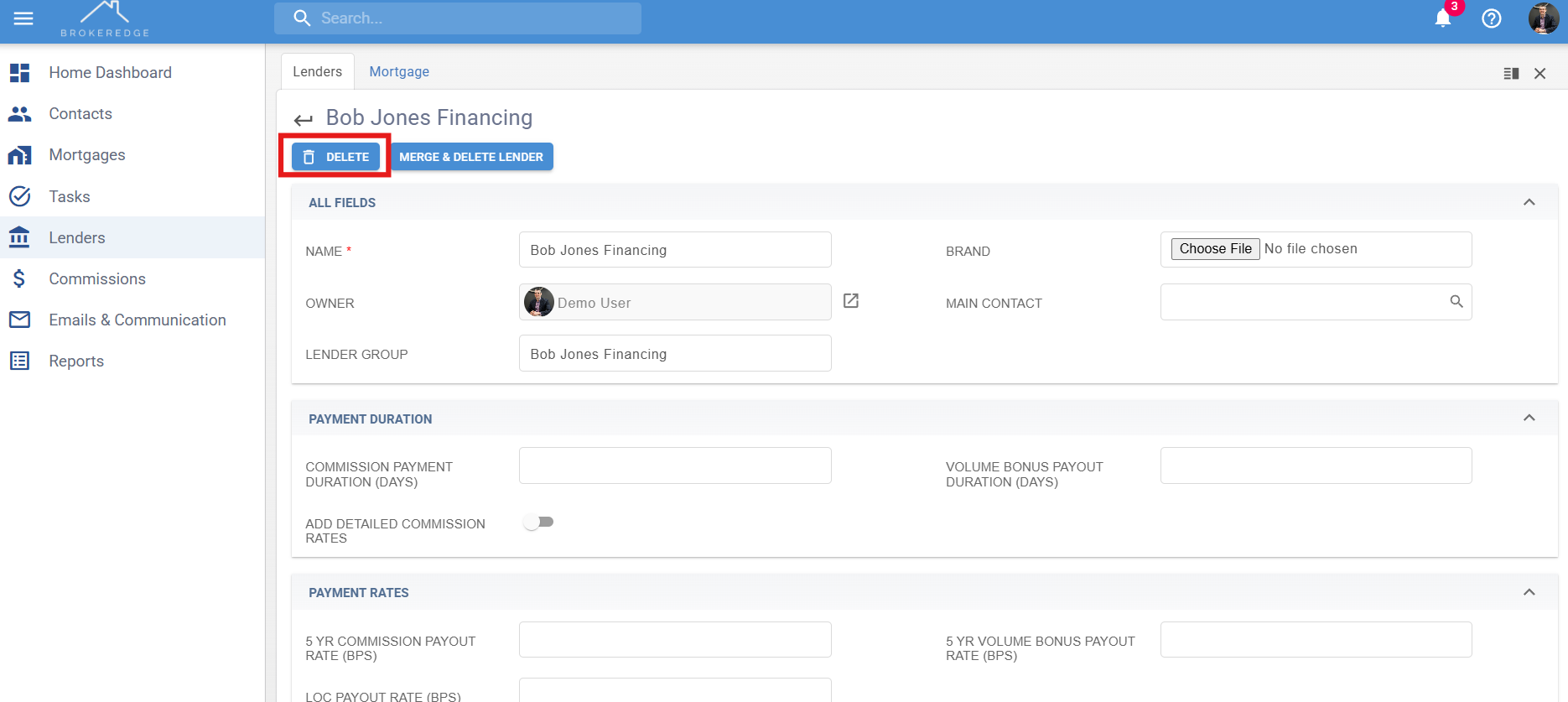 How to Delete Lenders If you need to delete a lender listed all you need to do is Go to the 'Lenders tab' on the left side of Brokeredge 2. Click on the lender you want to delete Click 'Delete'