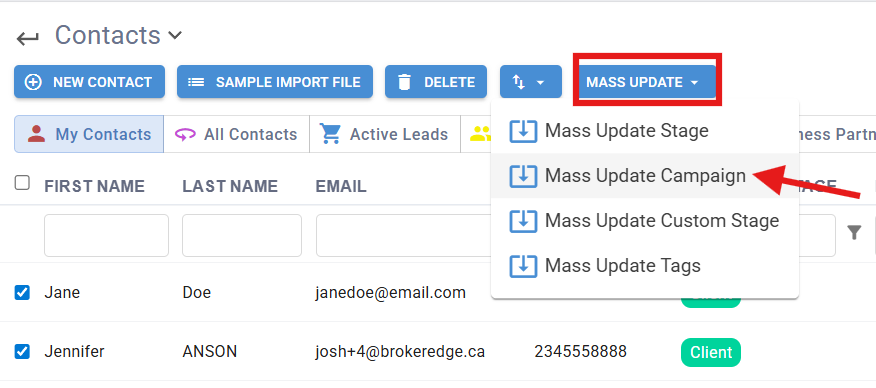 If you have a specific group of people and you want to mass update you can go to the contacts tab and check off each person that you want in the campaign and click "mass update campaign" and select the specific campaign name