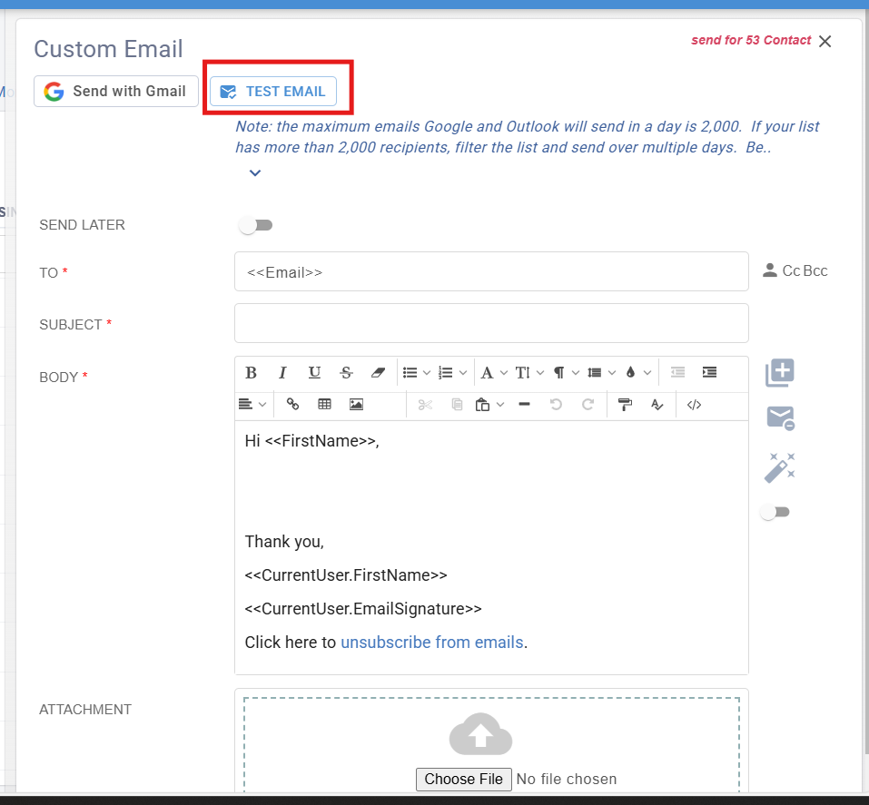 - Select 'Test Email' if you want to send yourself a copy to be sure it looks correct.
